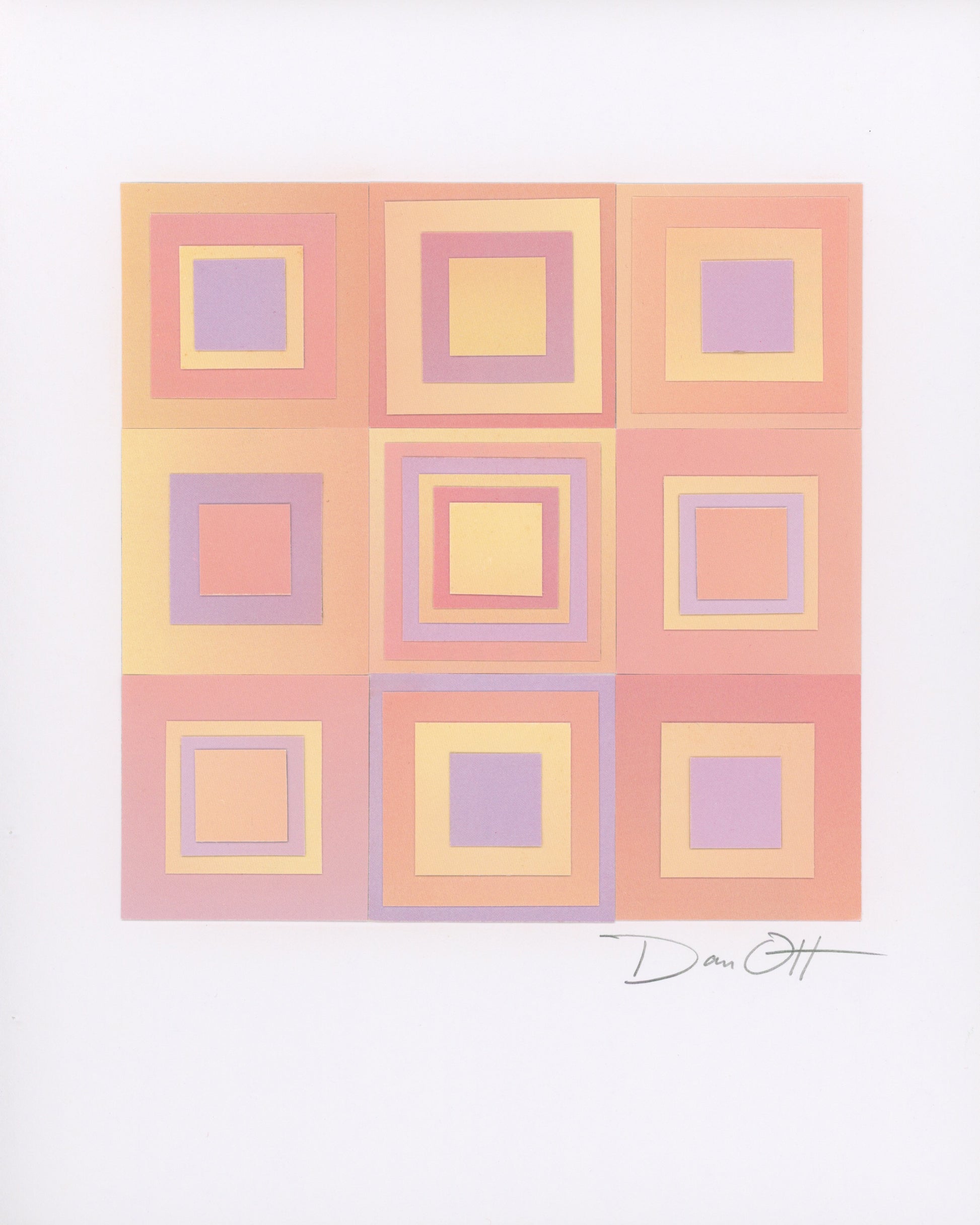 a comfy flow is a uniquely designed work of art featuring hand-cut geometric paper squares from vintage 1989 paint samples. Experience an aesthetically pleasing blend of modern and retro elements that will add a touch of sophistication to any space.