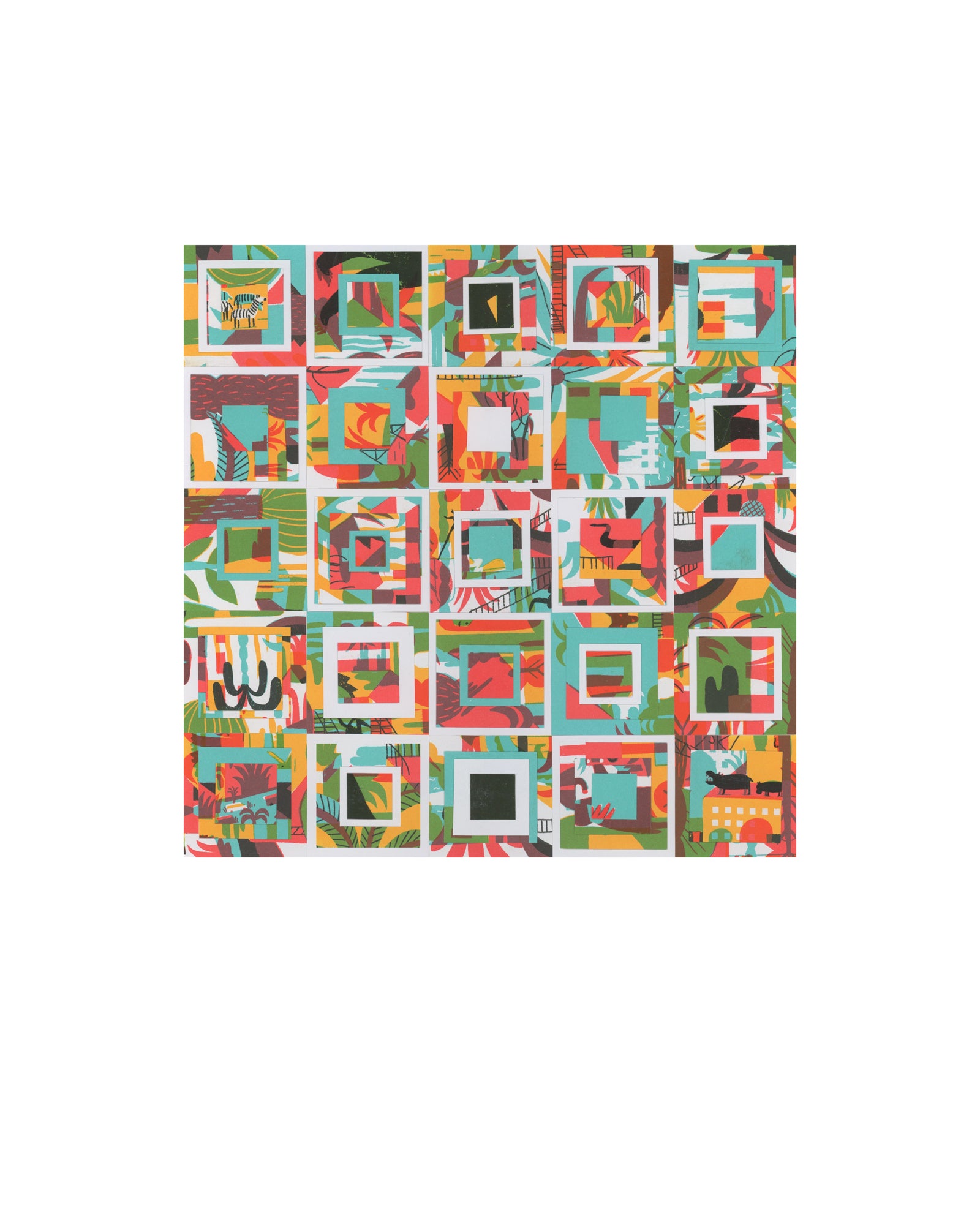 a vibrant, electric energy is a hand cut paper assemblage, made from brightly colored paper found in a discarded children's book. Immerse yourself in a world of exploration and imagination as you attempt to "figure out" these various colors and shapes.