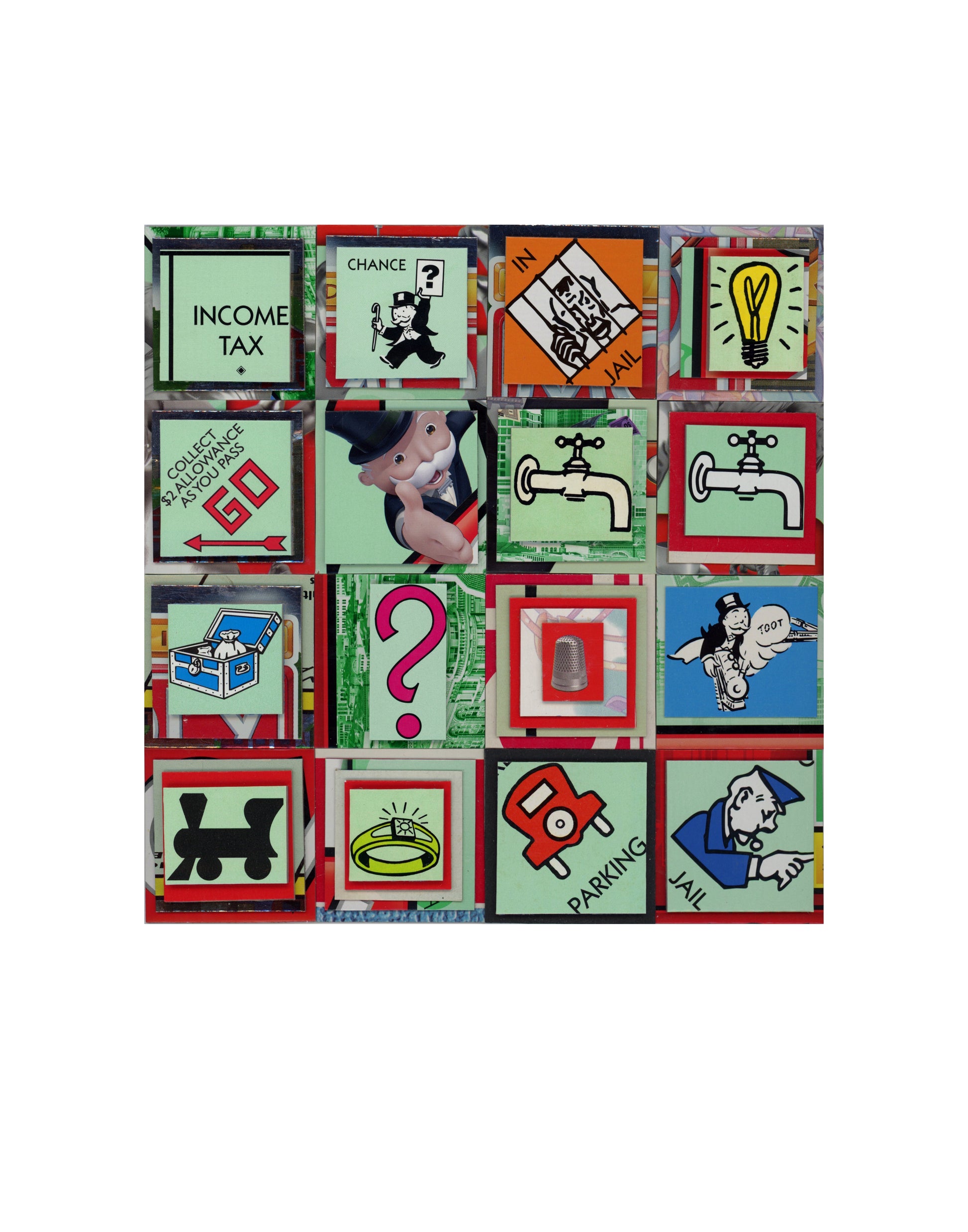 This unique piece of art, despite the rebranding, he's still "The Man" was created using a collection of genuine Monopoly boards and features recognizable icons from the game, set against a well-known color palette. A must-have for any Monopoly enthusiast, this piece will add a touch of nostalgia and charm to any space. Expertly crafted with attention to detail, this piece is sure to spark a great deal of interest and be a terrific conversation starter.