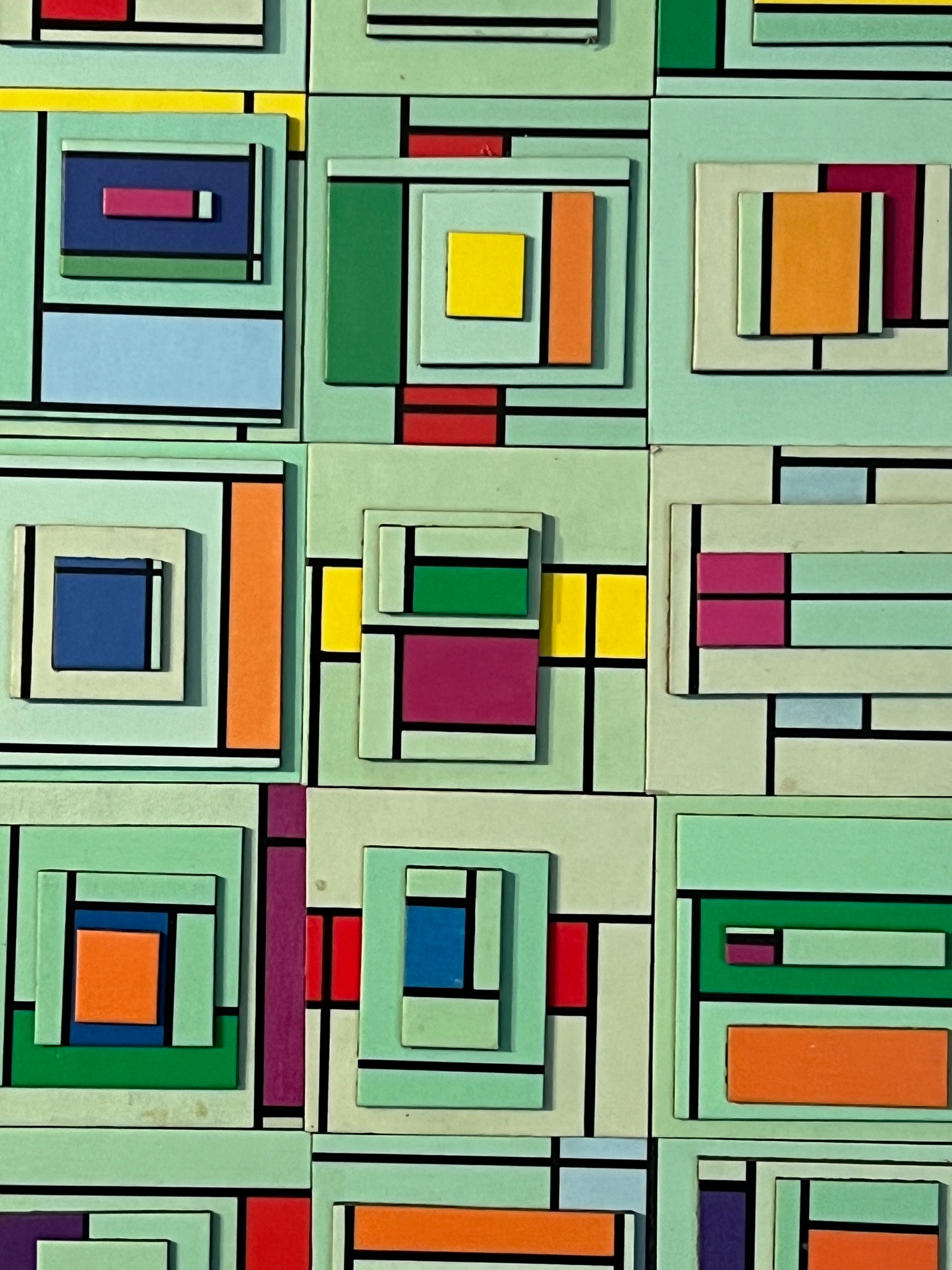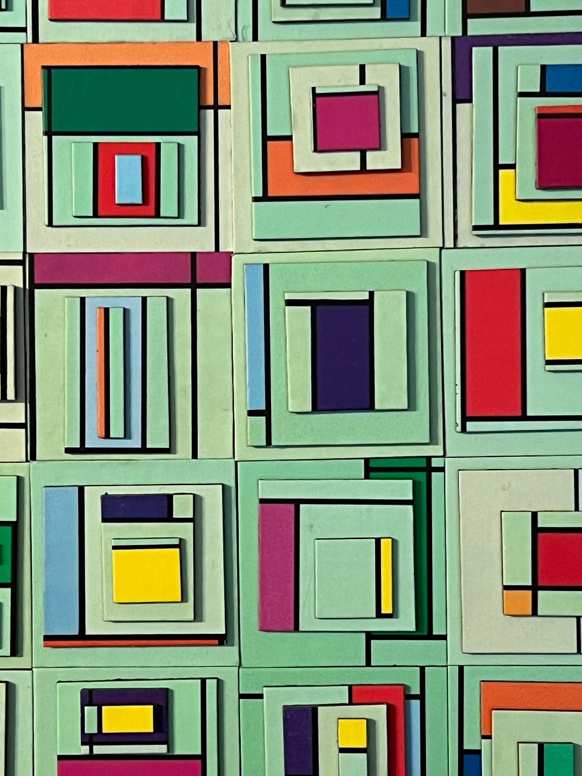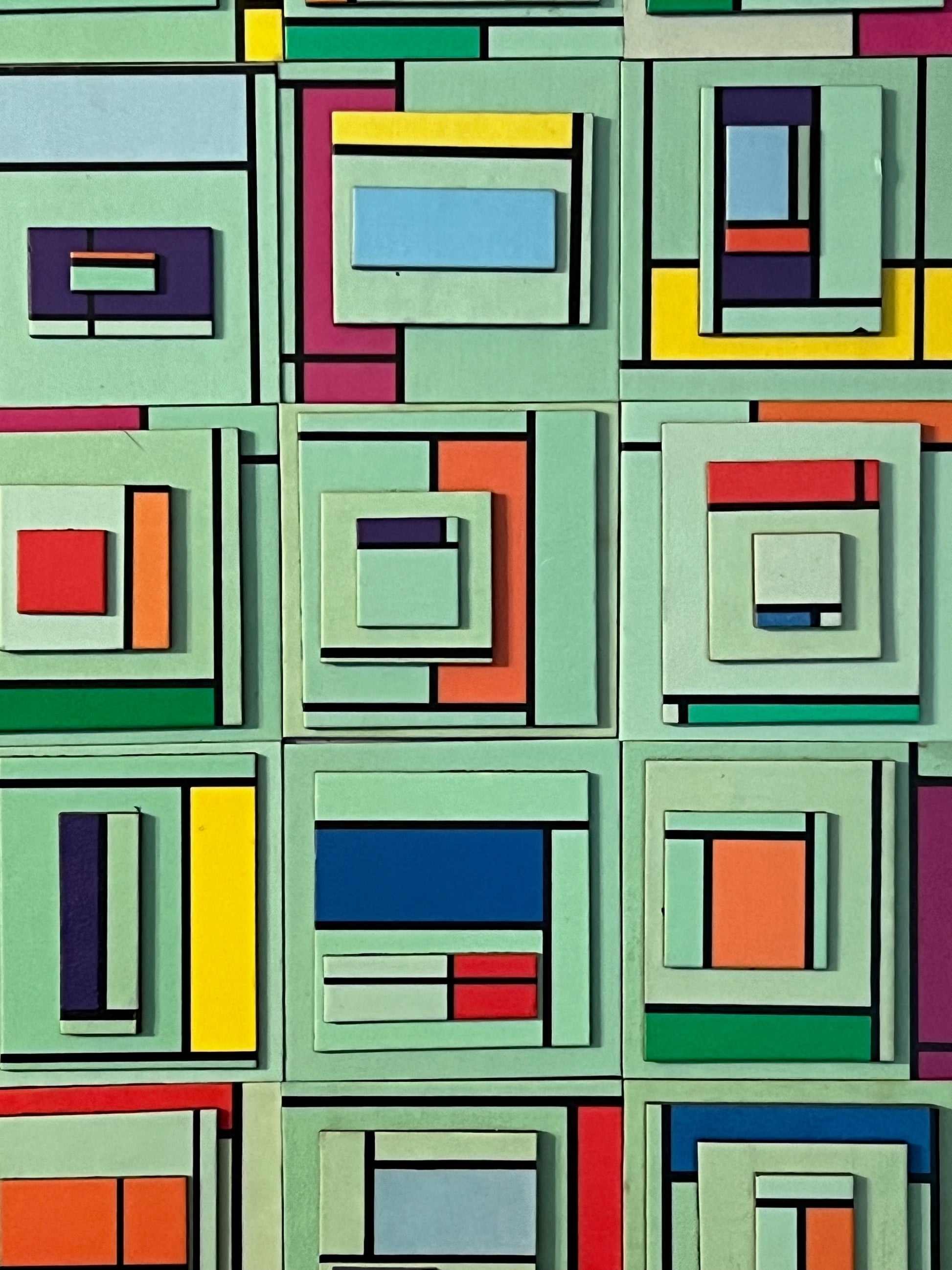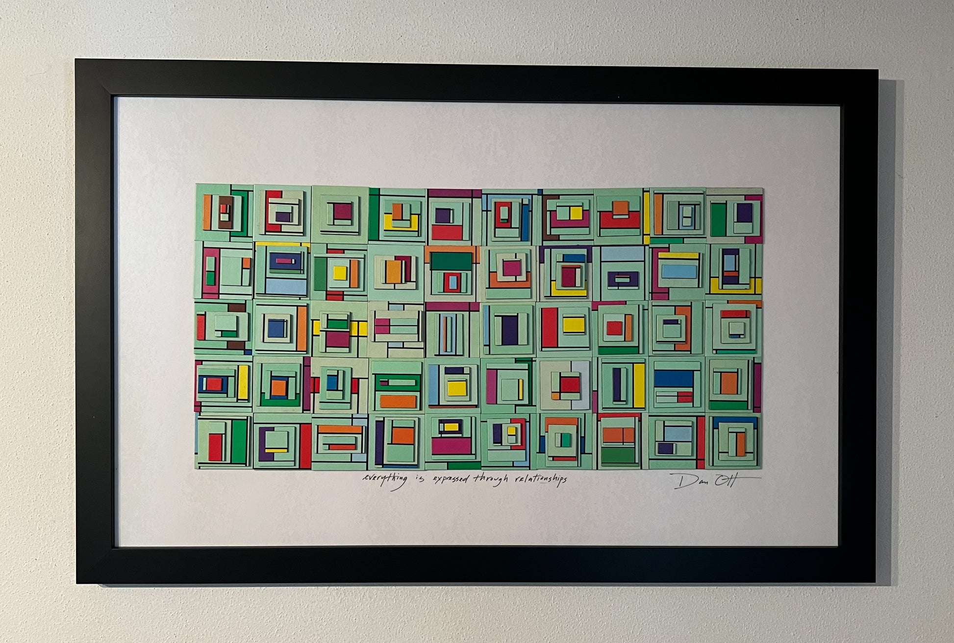 Immerse yourself in the world of Piet Mondrian with "everything is expressed through relationships". This one-of-a-kind art piece is created from 47 traditional monopoly boards, reduced to their primary colors and black lines. Fifty hand cut squares, stacked with smaller pieces of the board, provide great dimension to this piece. A stunning homage to the famous painter, this piece will add a sophisticated touch to any space.