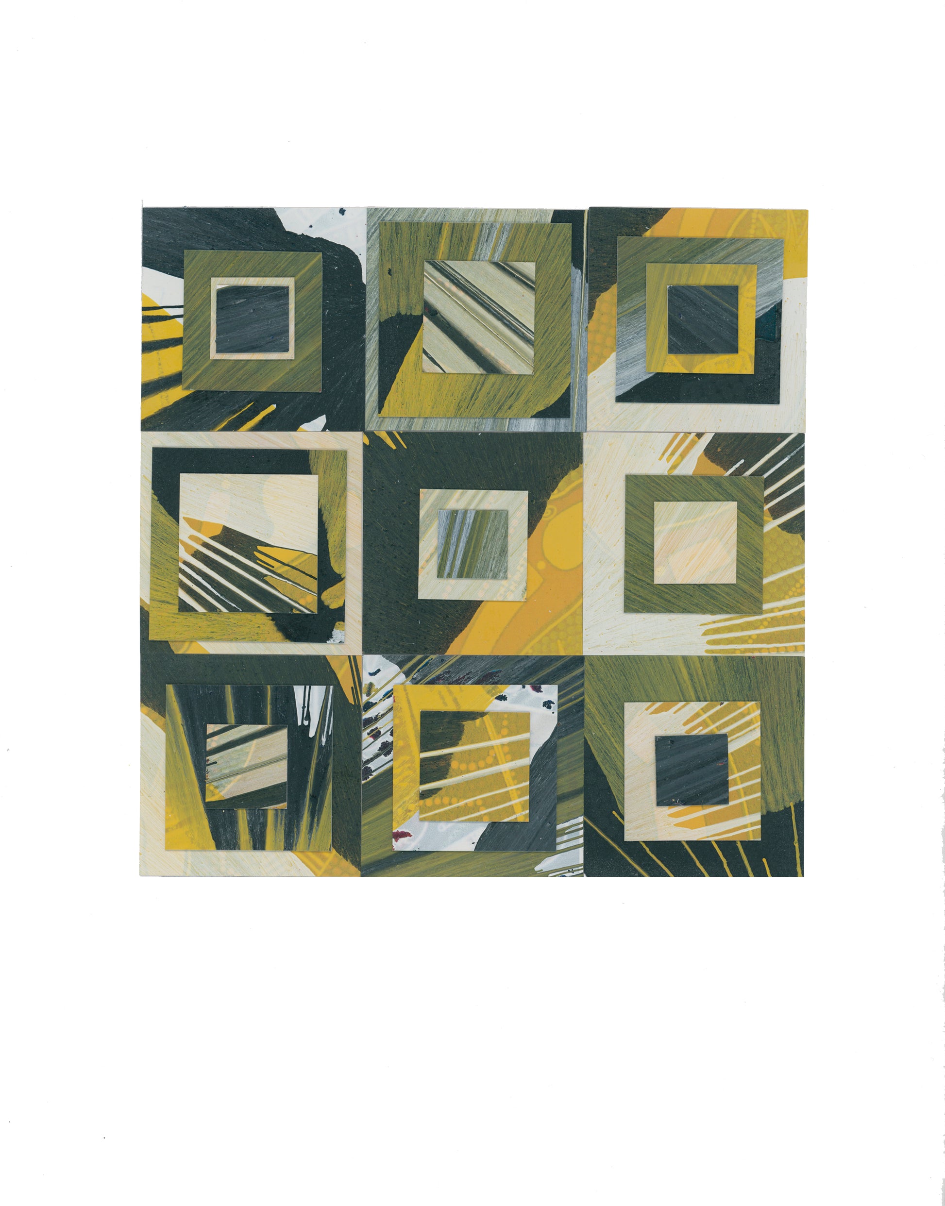 The nine hand cut squares in it's late, and I'm awake (8.5x11 unframed) came from acrylic paint on paper.