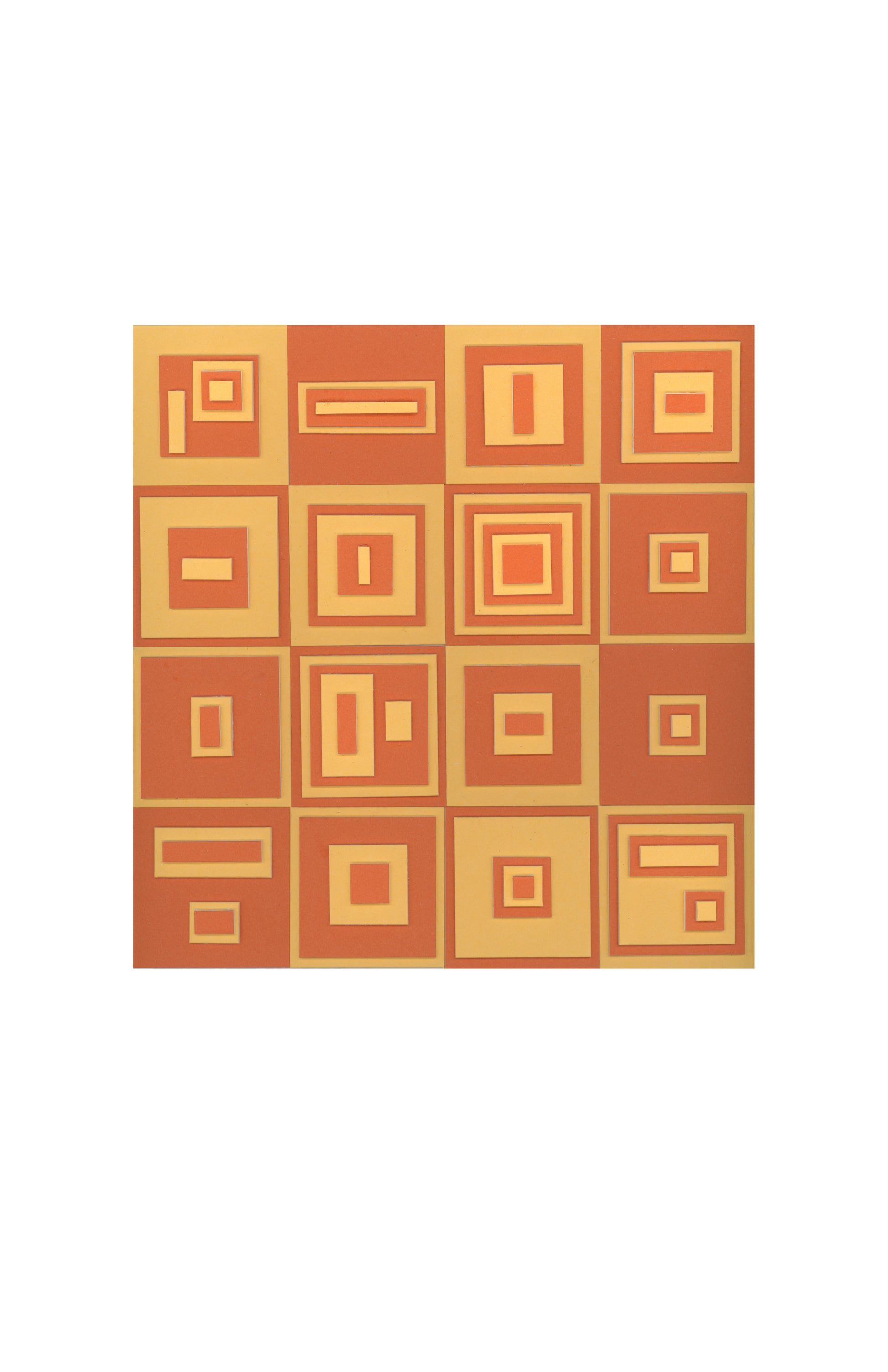 love is never boring is made from recycled mat board donated by a local frame shop. Consisting of 16 hand cut squares, this piece uses a random assortment of geometric shapes to further engage the viewer.