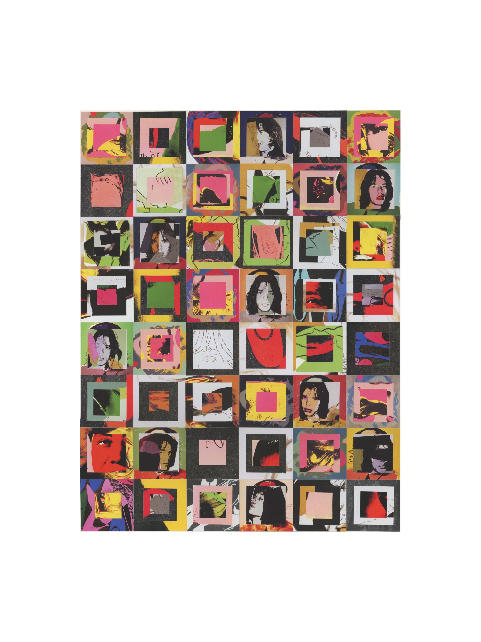Mick, Mao, & Andy is comprised of 40 hand cut squares and was made from a series of small Andy Warhol posters.