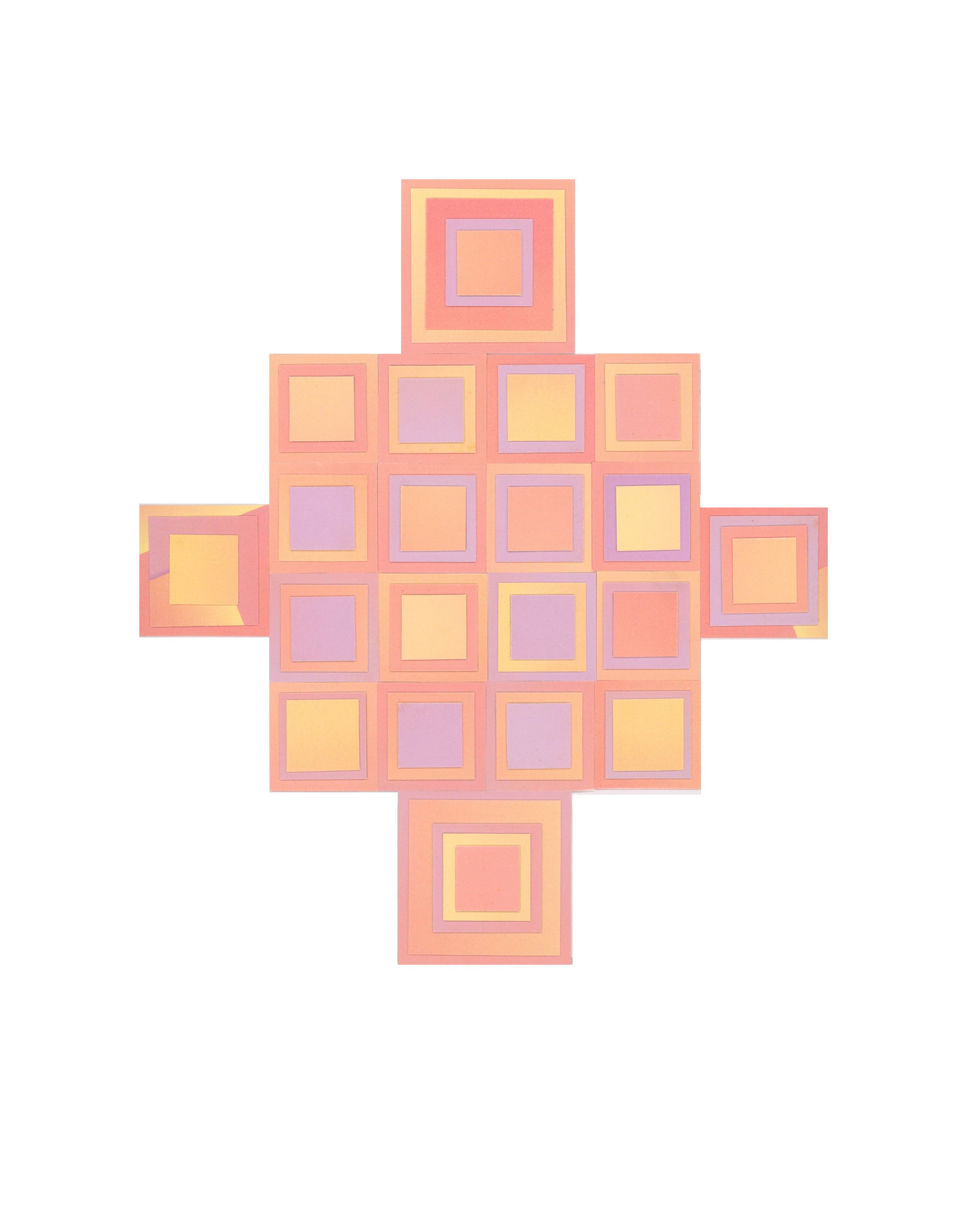 test colors is a uniquely designed work of art featuring hand-cut geometric paper squares from vintage 1989 paint samples. Experience an aesthetically pleasing blend of modern and retro elements that will add a touch of sophistication to any space.