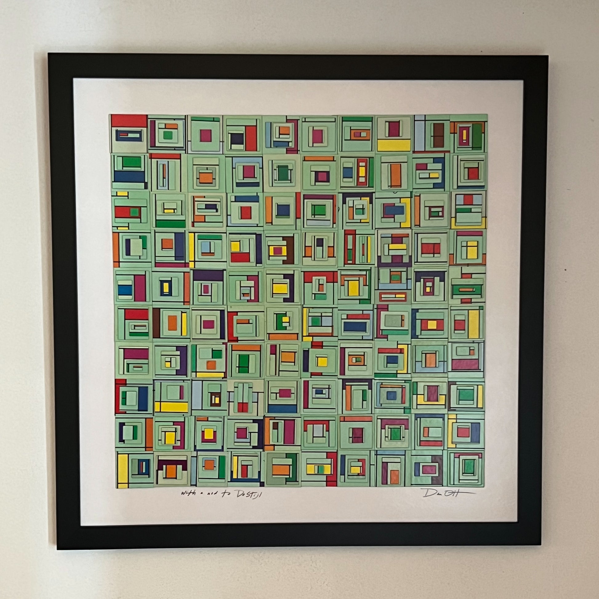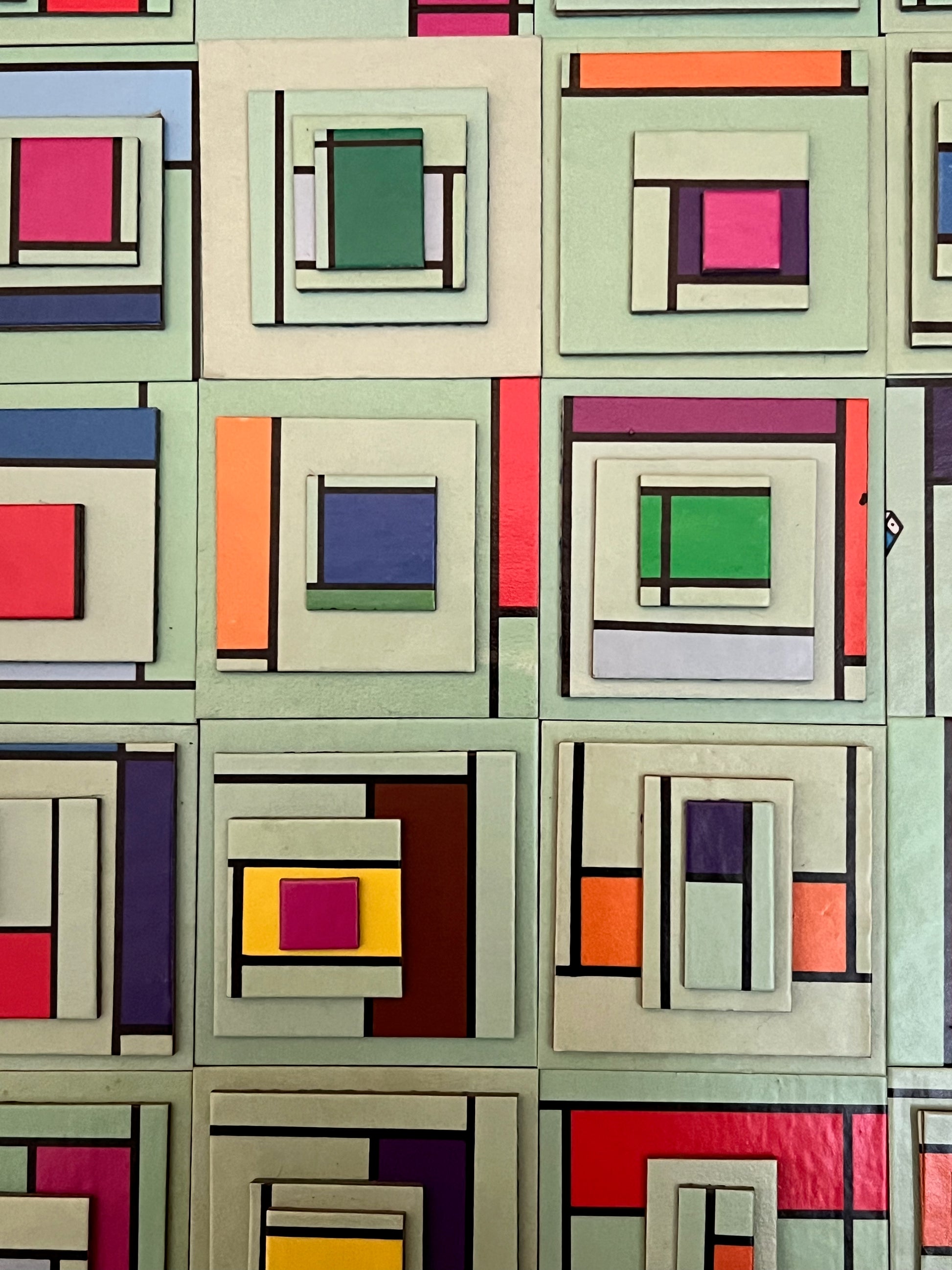 Immerse yourself in the world of Piet Mondrian with a nod to DeStijl. This one-of-a-kind art piece is created from 47 traditional monopoly boards, reduced to their primary colors and black lines. 100 hand cut squares, stacked with smaller pieces of the board, provide great dimension to this piece. A stunning homage to the famous painter, and his philosophy of DeStijl, this piece will add a sophisticated touch to any space.